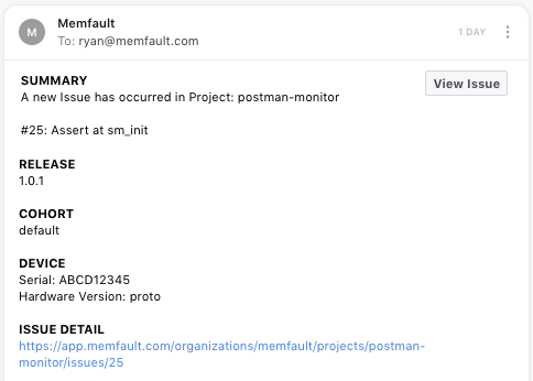 Memfault will now send out emails on new, resolved, regressed, and reopened Issues.
