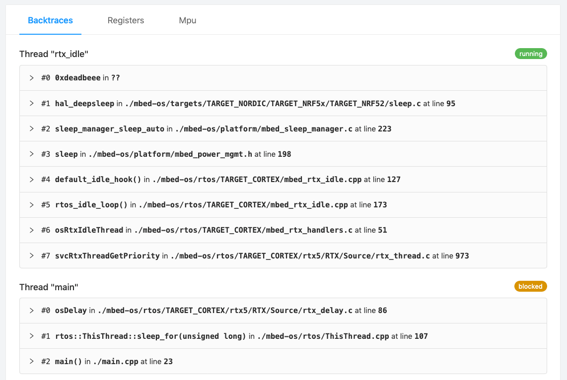 Memfault can now process traces generated while using the Keil RTX5 RTOS (used in the Mbed OS) and display traces for all the threads. Here's a portion of an example crash due to executing a bad function: