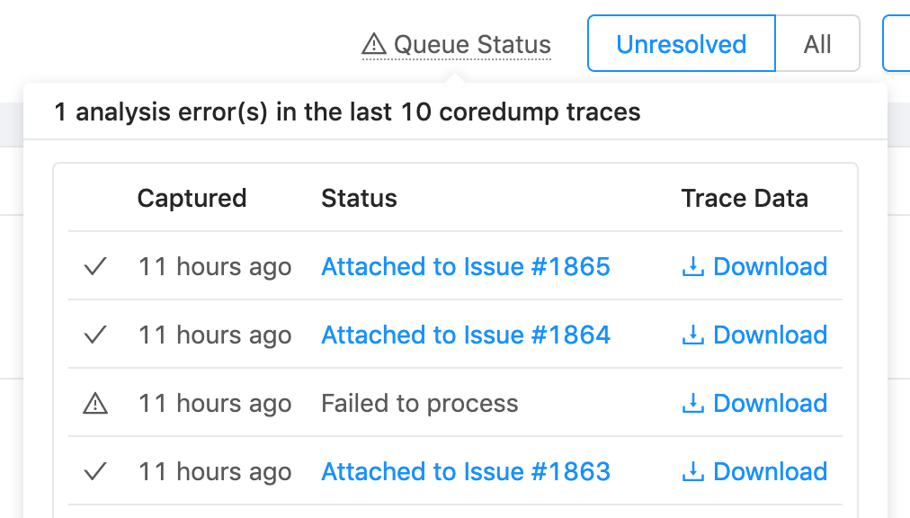 Easily know which coredumps were recently uploaded, if they experienced any errors, and which Issue they were attached to.