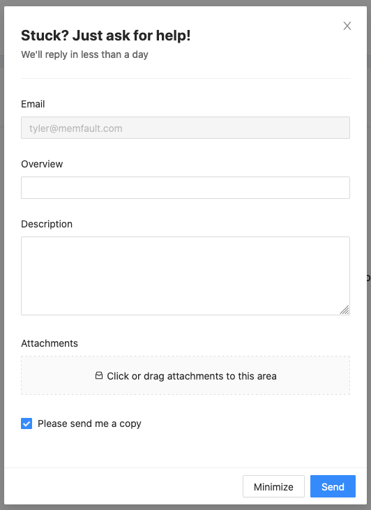 - Sometimes feel that reaching out to the Memfault team is too much of a burden? Hopefully not for much longer! We have added a way directly within the application to send us an email and we'll respond ASAP.
