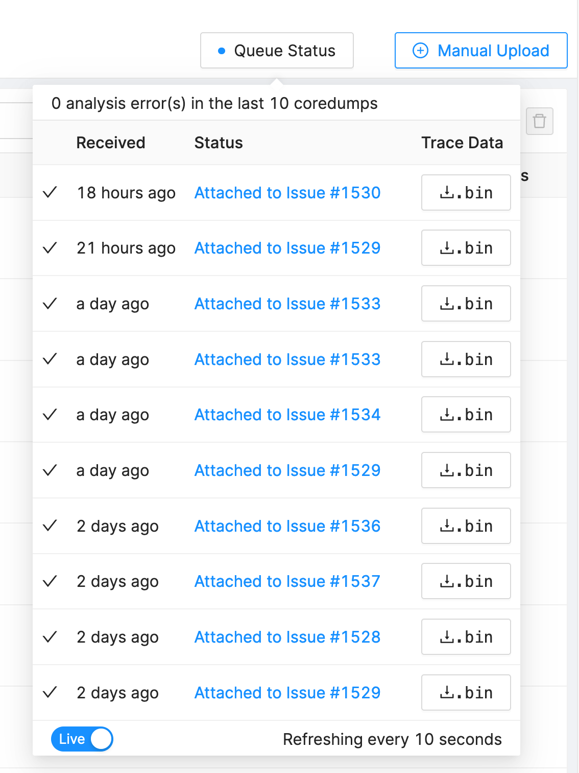 - Add an auto-refreshing queue status window on the Issues page. This makes it easy to know which are the most recent BugReport's or Coredumps from your devices.