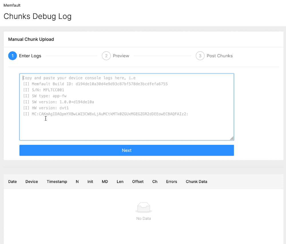 - Devices with the Memfault SDK hooked up will create chunks than can be printed out over the serial console for quick and easy access. We have a CLI tool that allows uploading chunks, but now we've made it even easier to quickly upload a chunk to Memfault for validation with the Manual Chunk Upload window.