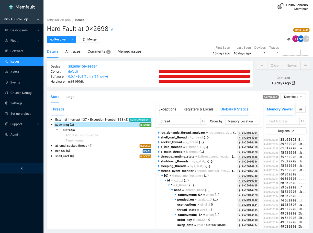 connection to report crashes and metrics to Memfault. Data is packaged as .mar