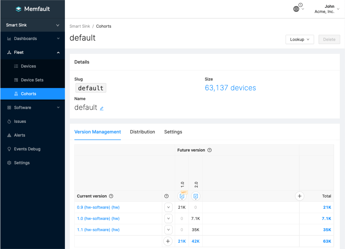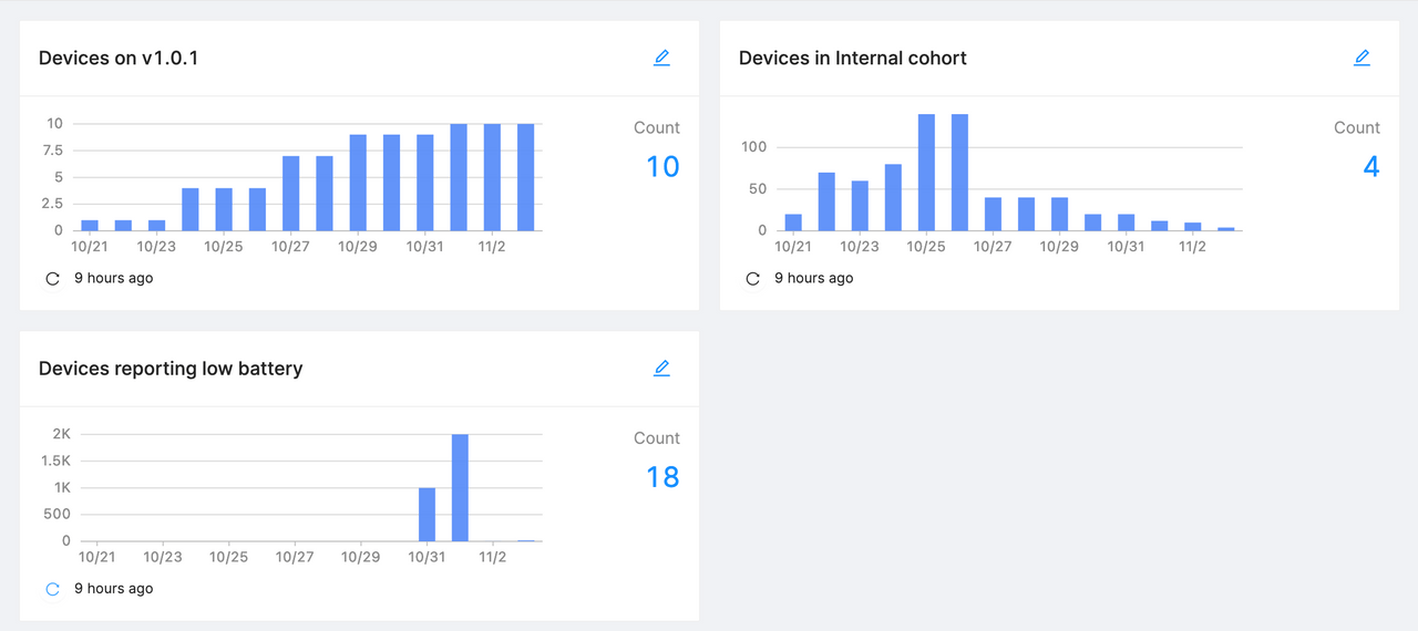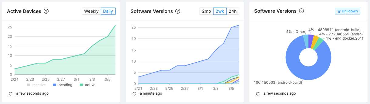 Memfault's Dashboard provides an overview of your fleet at a glance. We have updated the charts "Active Devices" (more sources used as signal) and "Software Versions" (only active devices considered) to better compare apples to apples.
