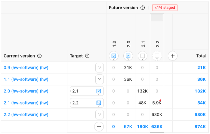 The visible time range for "Software Versions" can now be changed from "2 months" all the way down to just "24 hours". Since the same chart is now being used on the Cohort details page, it not only allows you to see long-term trends, but also acts as timely signal to observe the effect of an ongoing OTA software rollout.