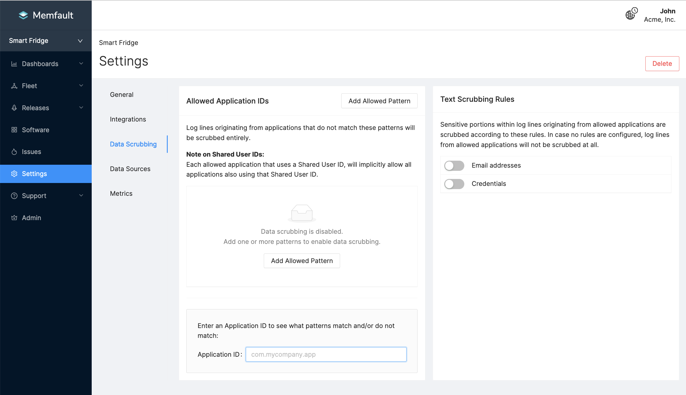 Memfault will start filtering by Allowed Patterns when the first Allowed Pattern rule is added, so it is important to add a comprehensive set of Allowed Patterns.