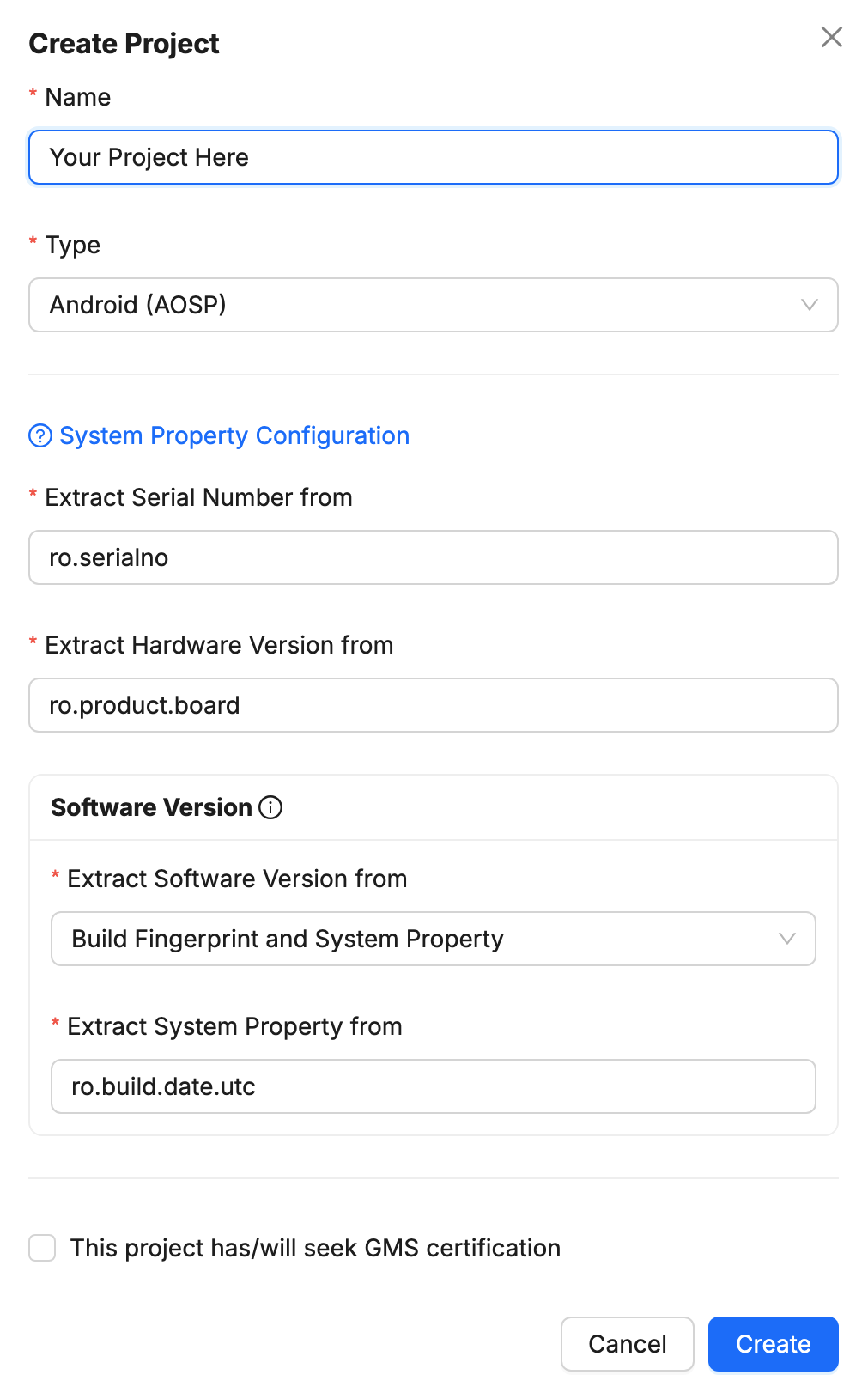Go to app.memfault.com and from the "Select A Project" dropdown, click on "Create Project" to setup your first project. Choose a name that reflects your product, such as "smart-sink-dev".