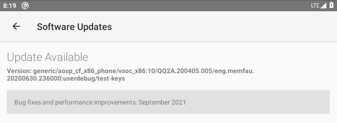 - Checking for updates (both regularly in the background, and manually via the system Settings menu). Check interval can be configured dynamically on the Memfault dashboard.