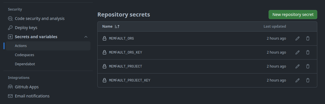 Set up some GitHub Actions secrets, for the Organization Auth Token and the Memfault Organization and Project (for private repos, those last two don't need to be secrets).