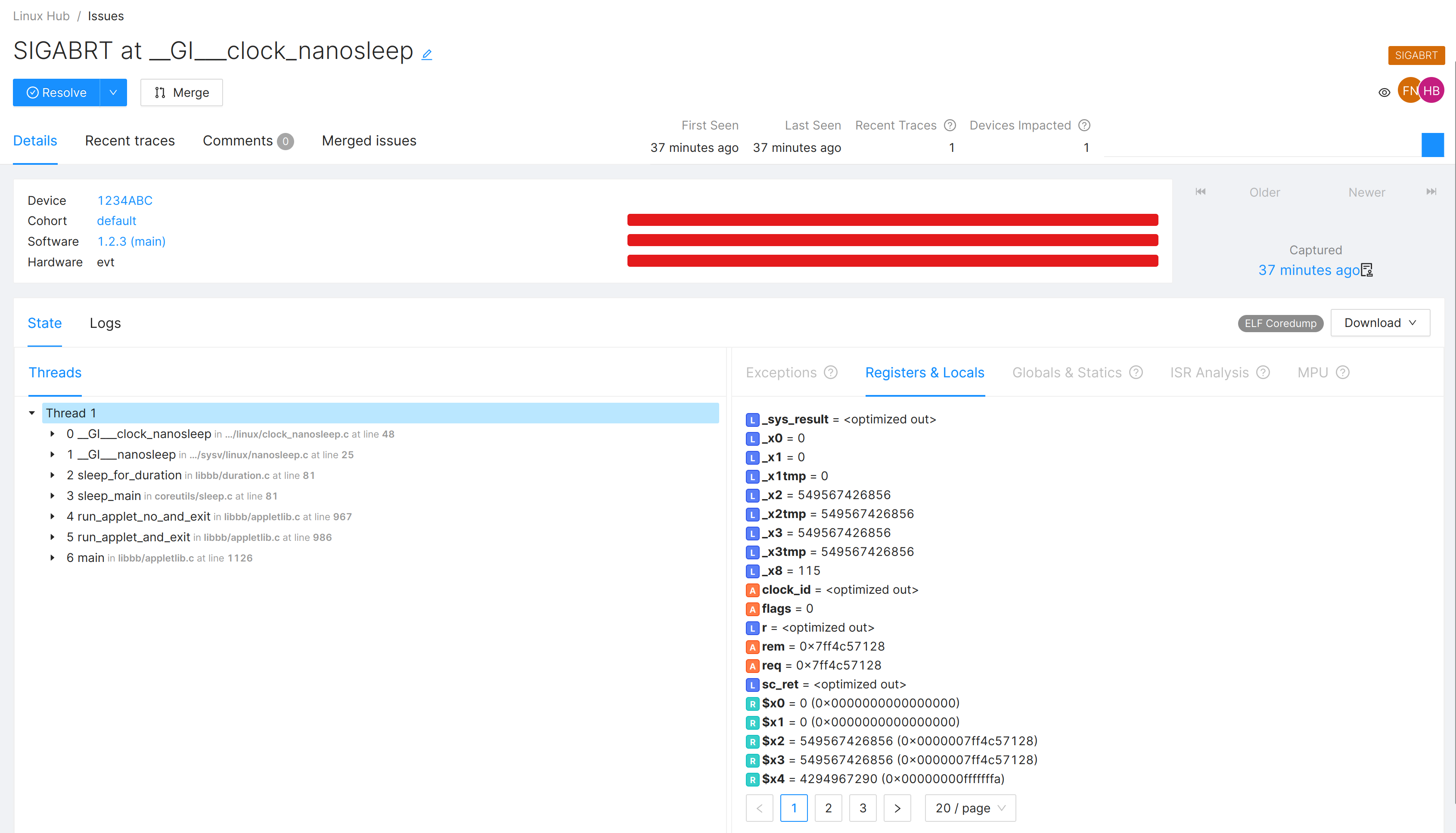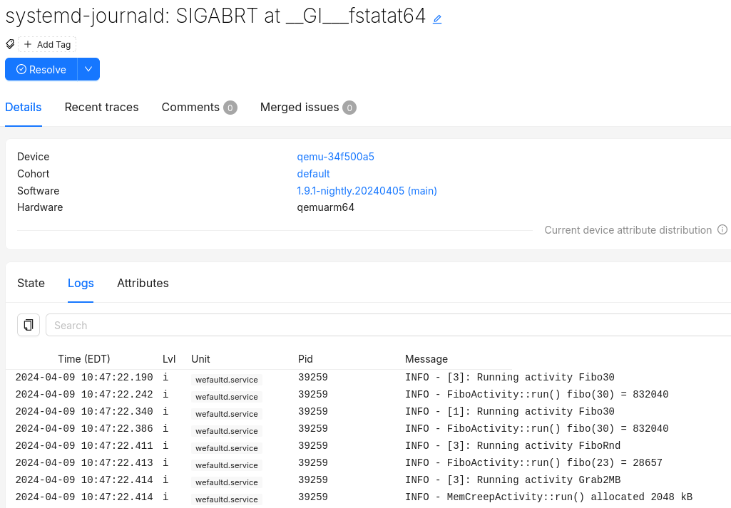 Memfault (which are then symbolicated into lines of source code). This strategy