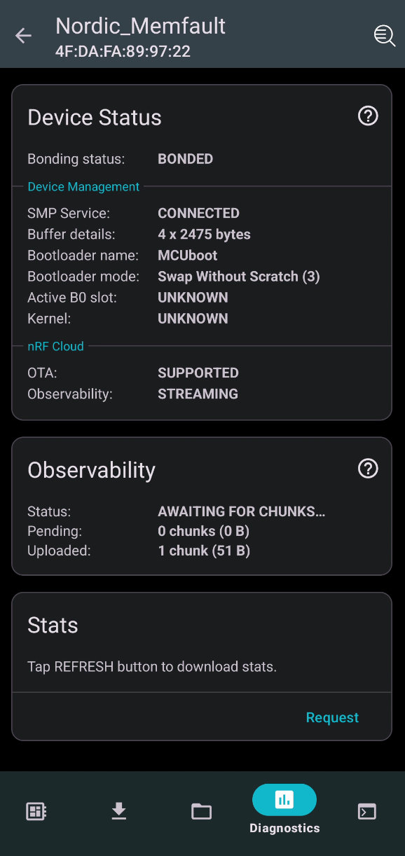- Tap the "Logs and Stats"/"Diagnostics" tab - see that data is automatically uploading to Memfault via the Memfault Diagnostic Service (MDS)