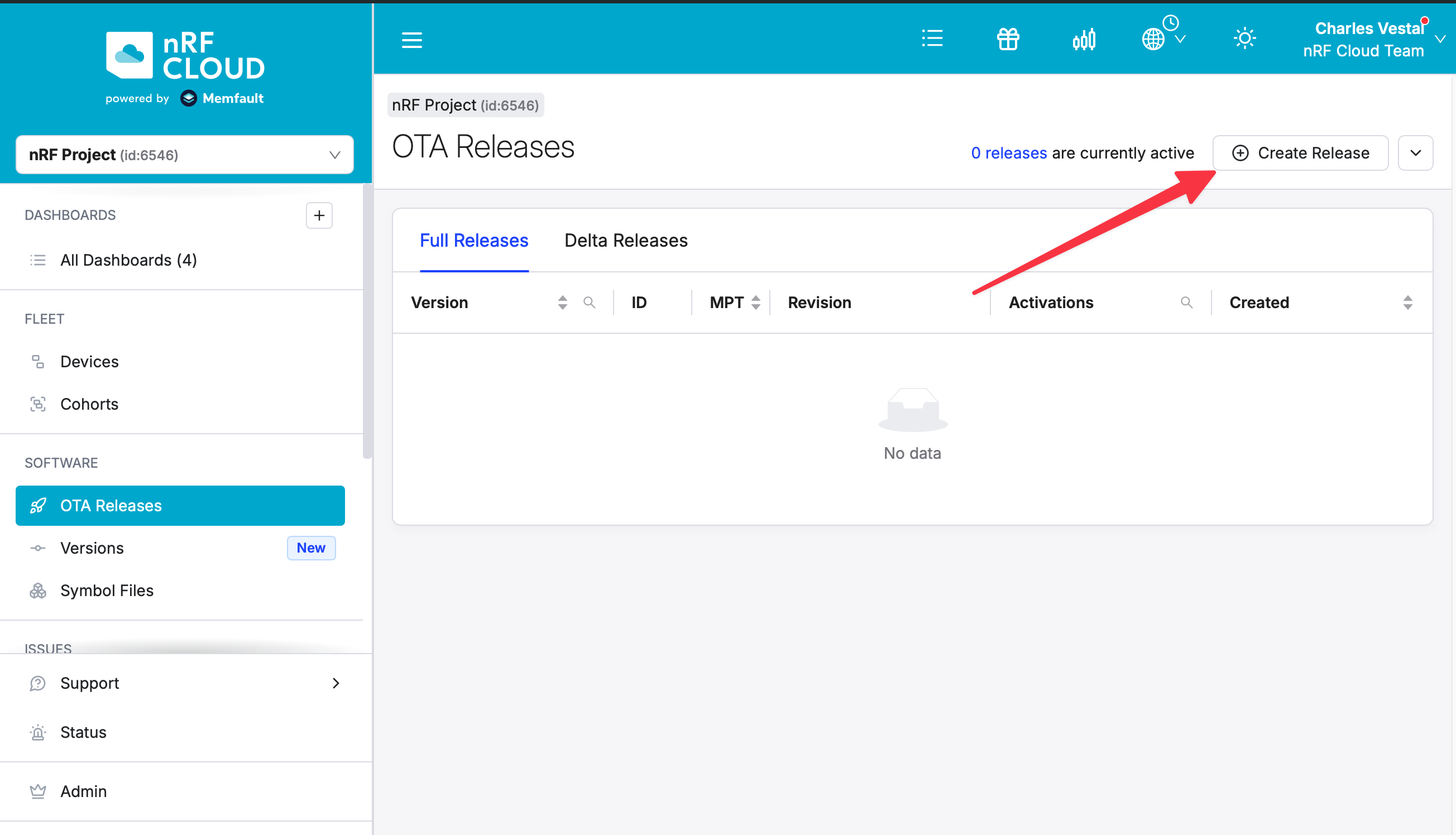 nRF Cloud OTA Releases page with Create Release button