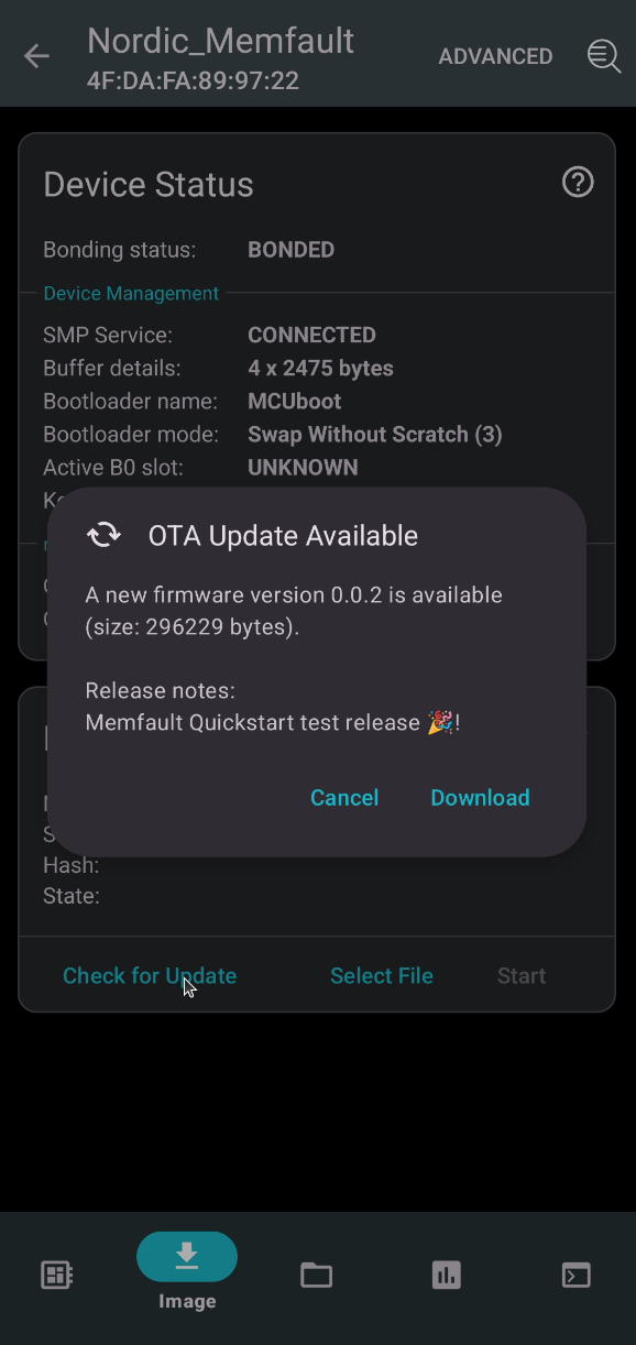 Using the nRF Device Manager app, you can tap "Update" to trigger an upload to nRF Cloud, forwarding new diagnostic data to the system.