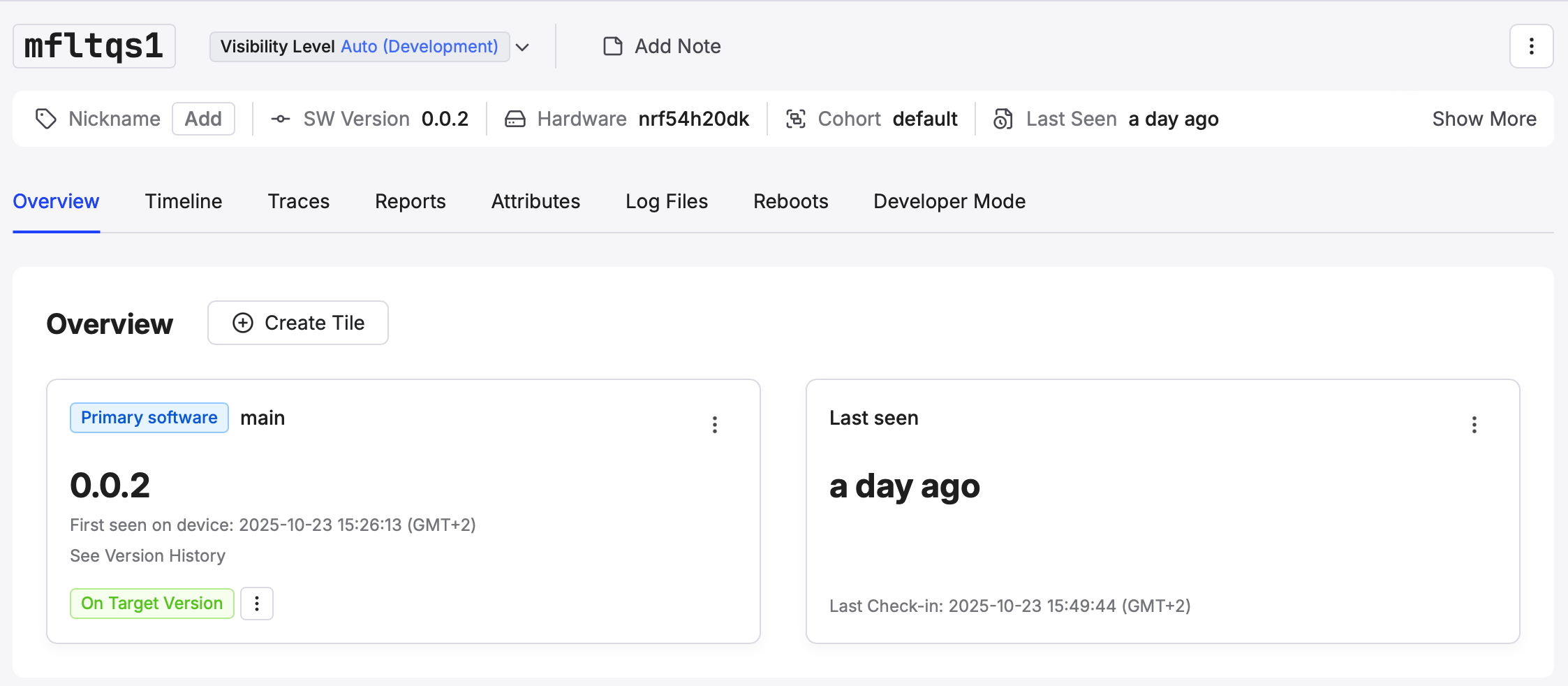 This will show the current version (0.0.2), and when it was last seen (likely just a few minutes ago since the Device rebooted after the update.