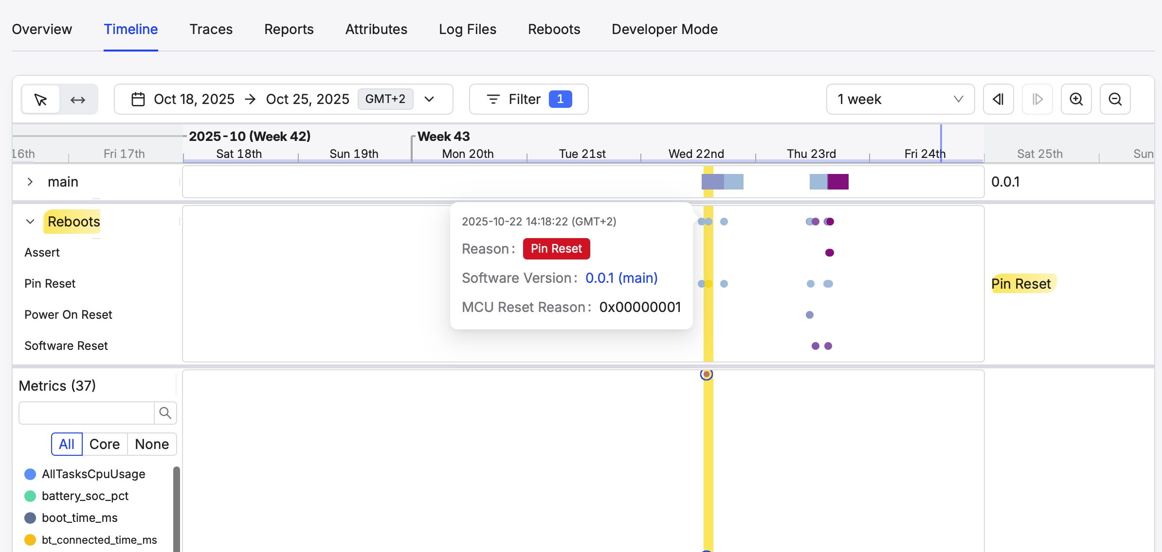 nRF Cloud Device timeline with metrics, Traces, and reboots