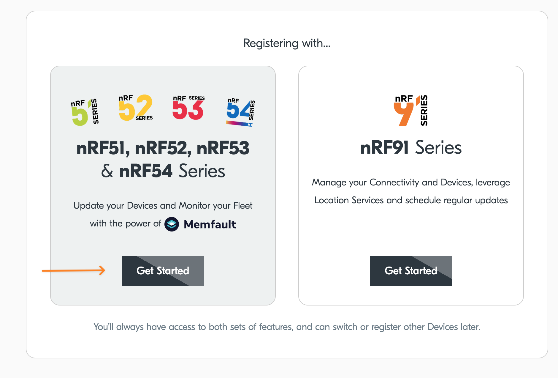 After registering, you'll be prompted to choose nRF Cloud Powered by Memfault or legacy nRF Cloud as your default experience. As we are setting up an nRF52/53/54 Device, choose the "nRF51, nRF52, NF53 & nRF54 Series" option on the left to proceed to the nRF Cloud Powered by Memfault interface.