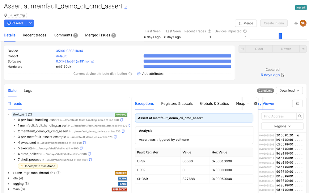 In nRF Cloud, visit Issues to see the symbolicated crash with full stack Trace.