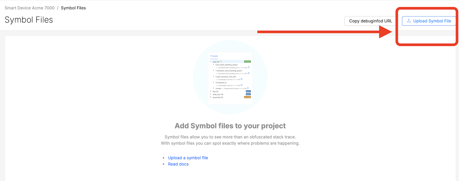 Next, upload the Symbol Files for this build, zephyr.elf, located in the