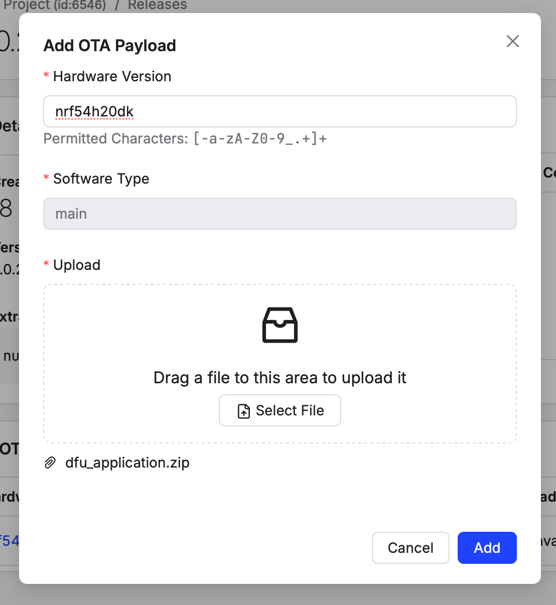 From the Release details, add an OTA payload to this Release