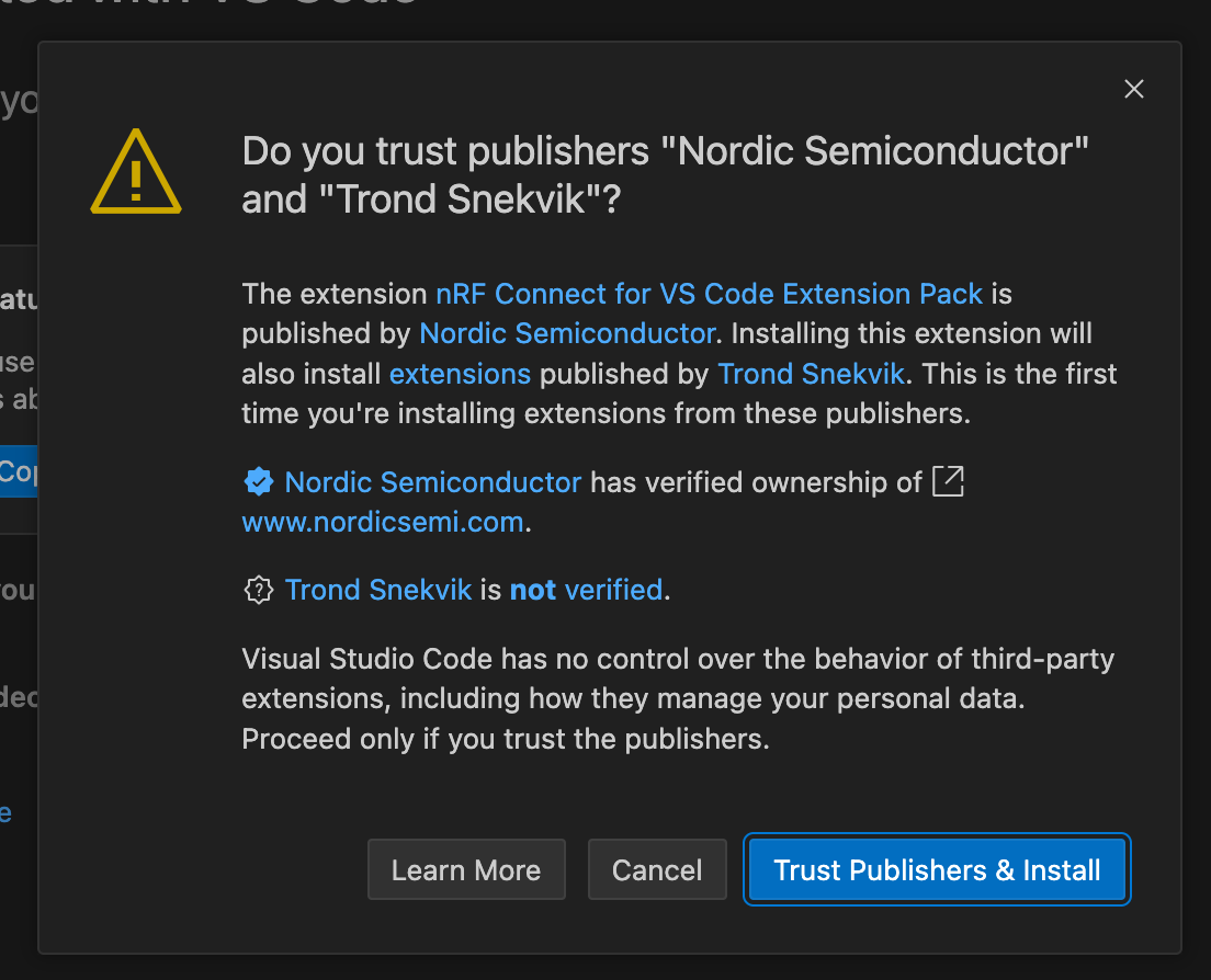 If prompted to trust publishers "Nordic Semiconductor" and "Trond Snekvik", choose "Trust Publishers & Install"