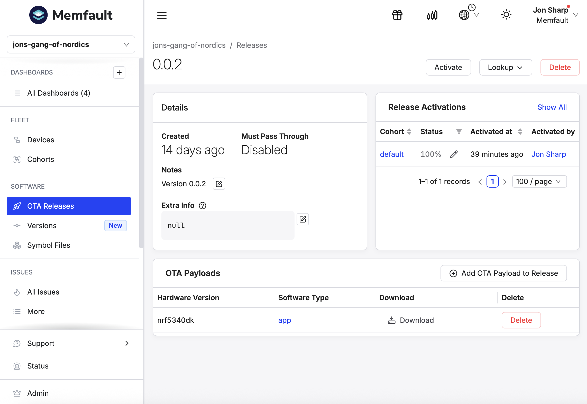 Upload the OTA payload and symbols to Memfault using the Memfault CLI: