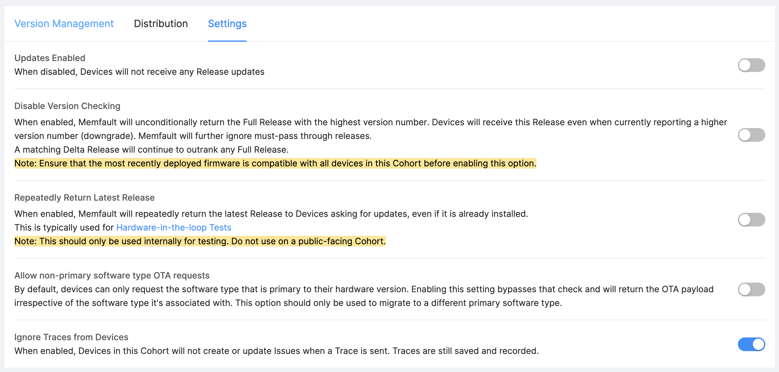 When enabled, new Traces from Devices in this Cohort will not be grouped into any Issues. However, Traces will still be recorded, and will be visible with limited details in the Timeline and Traces tabs on the Device detail page.