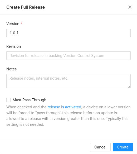To create a Full Release, click on the Create Release button on the top-right area of the OTA Releases view. Among other information, you'll be prompted for a version and whether the Release is a must-pass-through (MPT) Release.