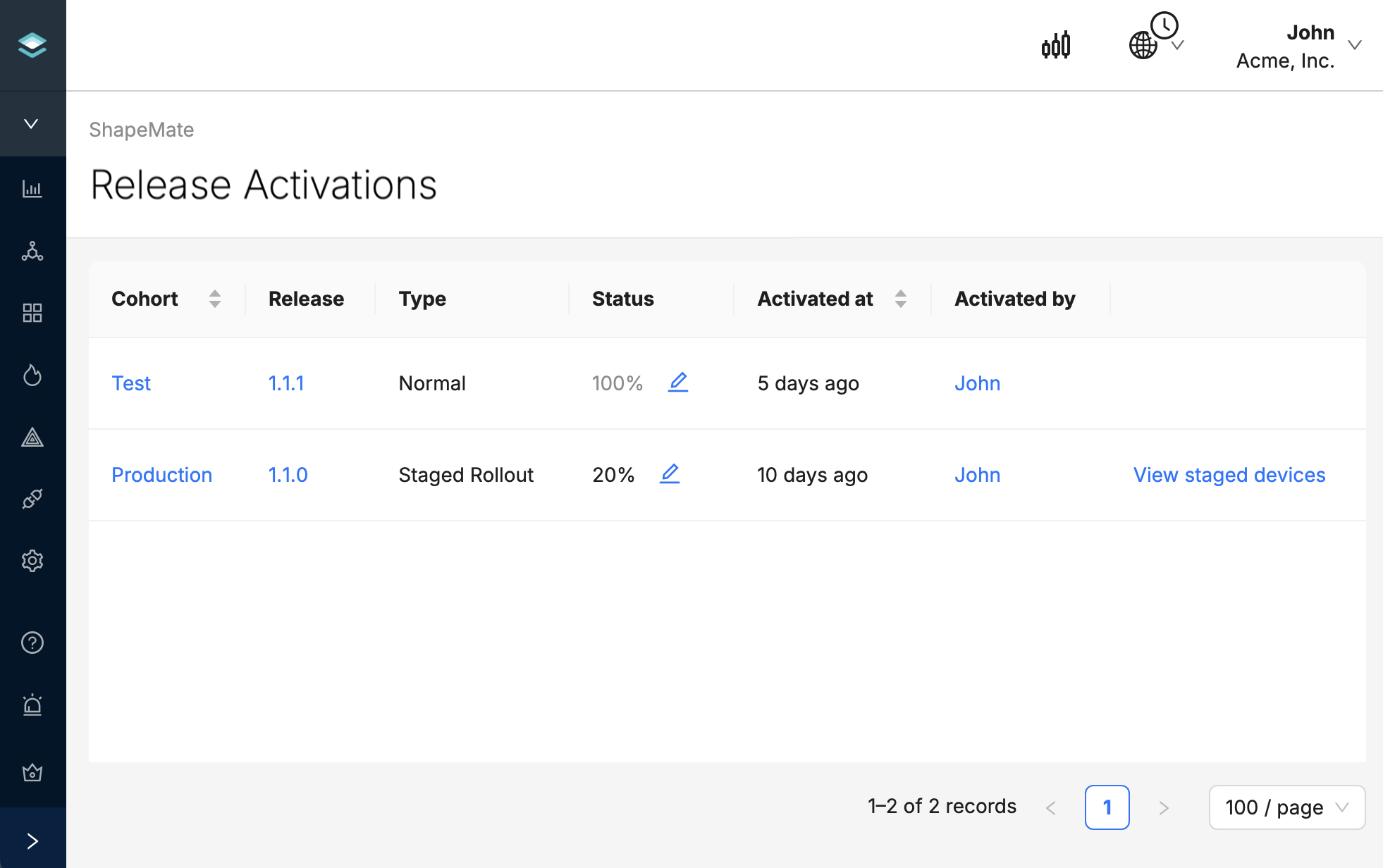 When a staged-rollout Release Activation is created for a Cohort, a random subset of its devices (amounting to the selected rollout percentage) will be marked as staged in this Cohort. Staged-rollout release activations are only applicable to devices that are staged in the Cohort.