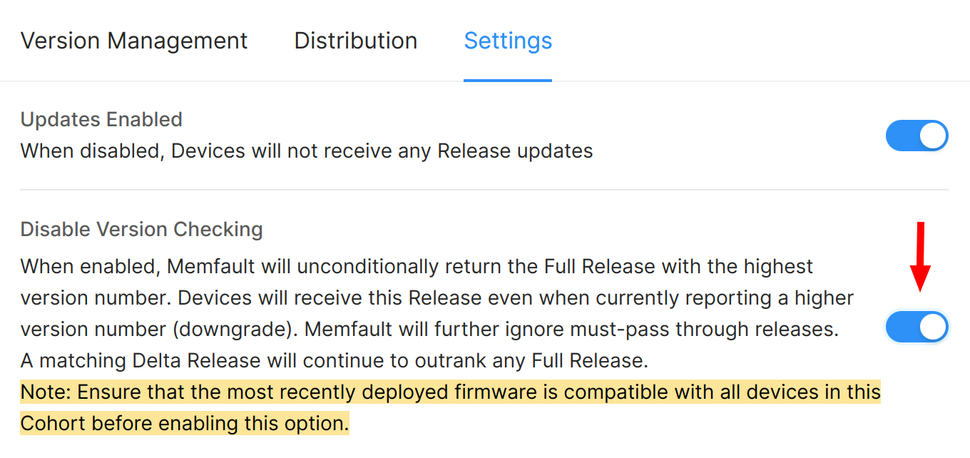 Under the Version Management tab, you'll find the version matrix: a live view into the very next OTA update that each device in this Cohort will receive.