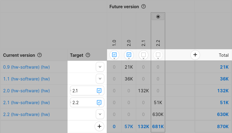 The version matrix consists of rows representing current versions that are currently reported by devices in the field. Its columns represent future versions devices of the Cohort will report (after having applied OTA releases). What follows is a tour of the different interface elements of the version matrix.