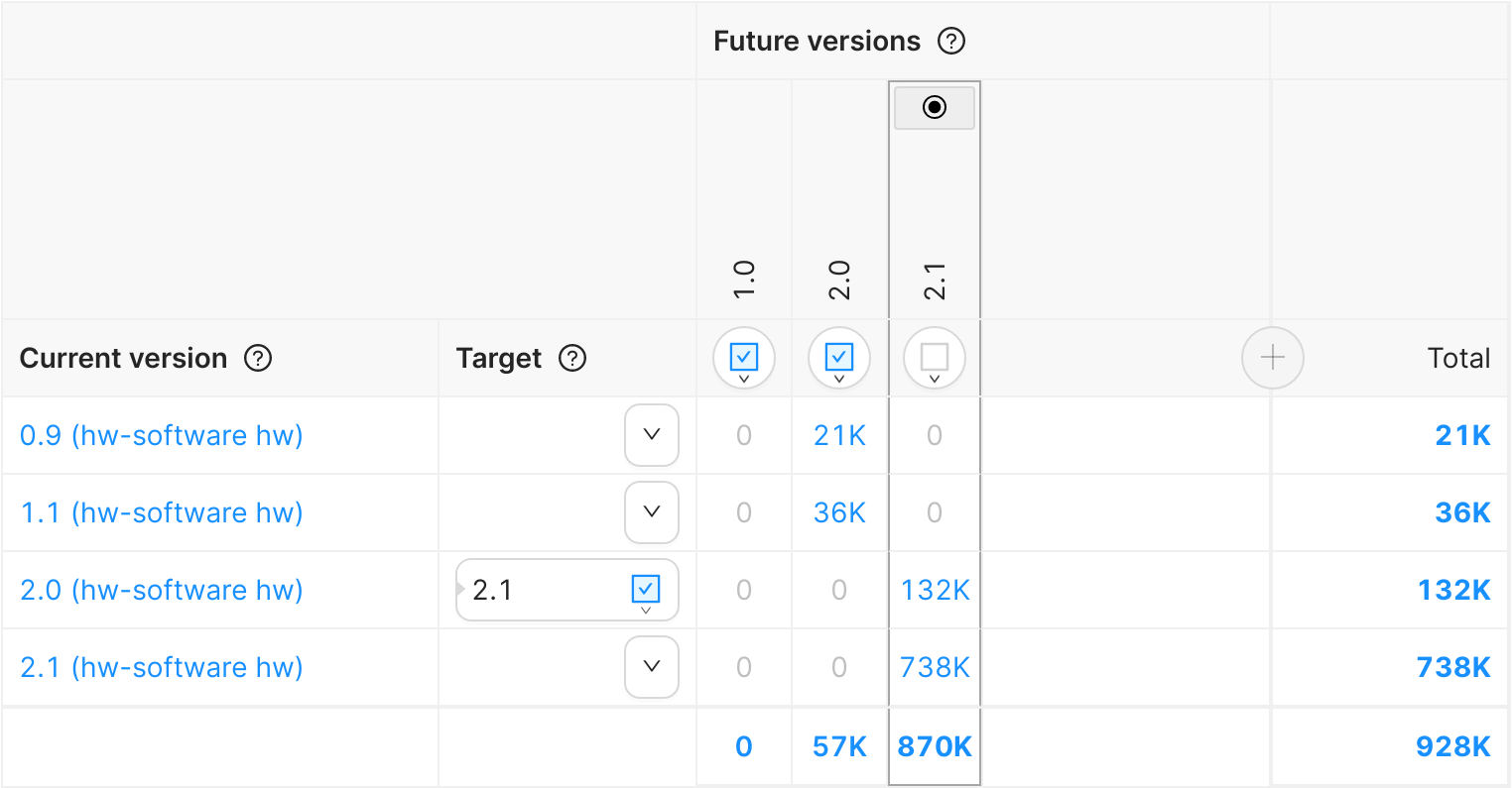 In each cell of the version matrix you'll find a count of devices. If, for example, a device count of 10K showed up on a cell in the intersection of row version 1.1 and the column 2.0, that would mean 10K devices are currently on version 1.1 and the immediate next step they're going to take is to download an OTA payload for a Release with version 2.0.