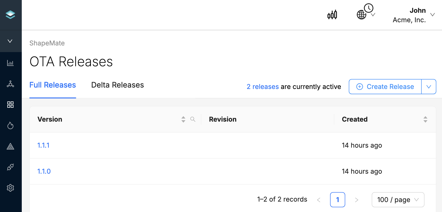 The OTA Releases section of the Memfault application can be accessed from the main menu on the left side. In it, you'll be able to access a list view of all Full Releases and the equivalent list view for Delta Releases by selecting one of the tabs under the title of the page.