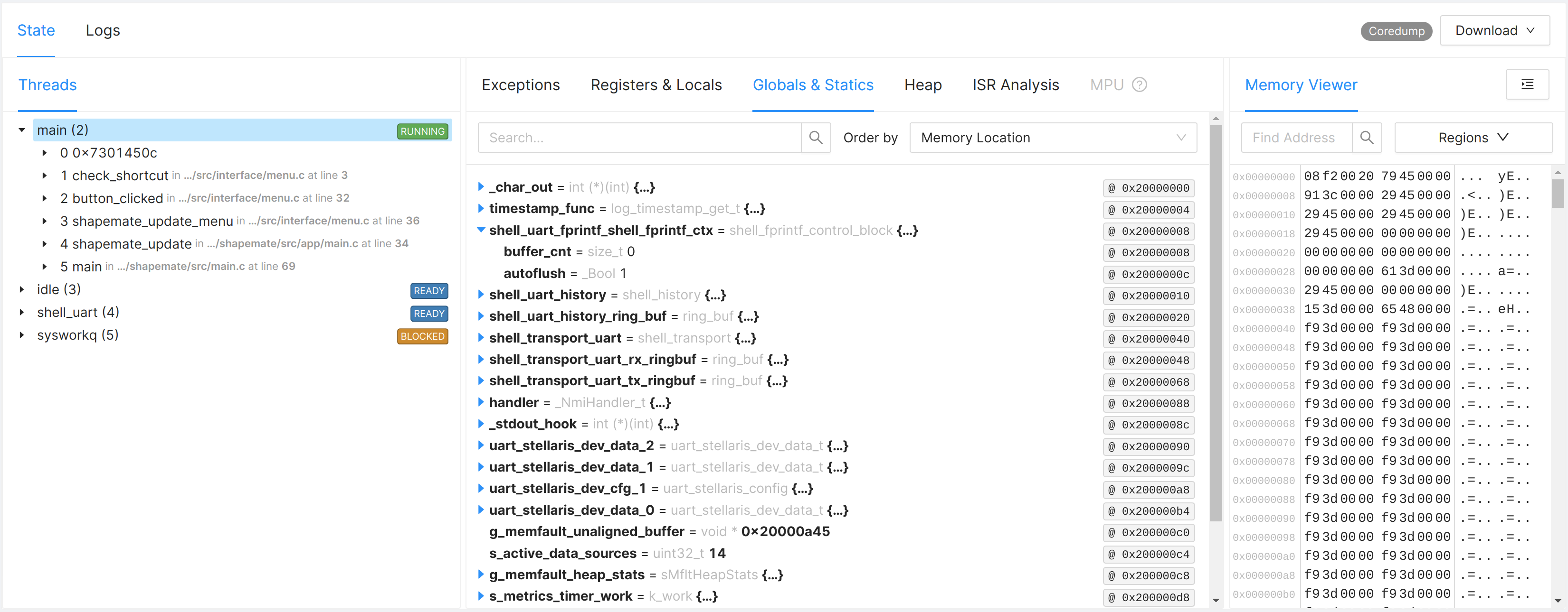The Memory Viewer is a low-level view of the memory of the device at the time the coredump was captured: